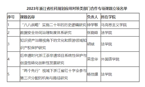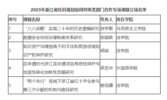 6月1日,浙江省哲社科工作办公示了2023年度浙江省社科规划应用对策类部门合作专项课题拟立项名单,我校教师分别获得党史和文献工作研究、互联网发展研究、文化和旅游发展研究、“红十字”事业研究等5项部门合作专项课题立项资助。