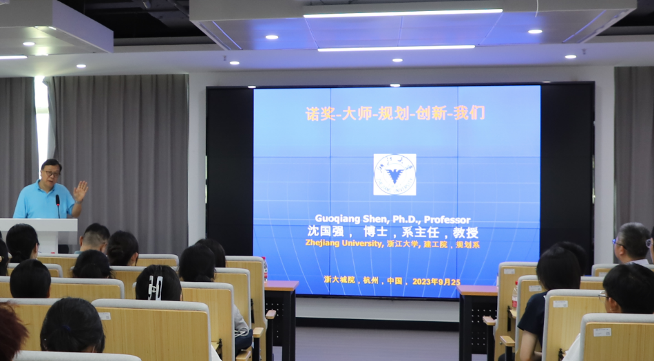 沈国强教授为全体2023级城乡规划本科新生带来了题为《诺奖-大师-规划-创新-我们》的专题学术报告,报告会由国土空间规划学院院长鲍海君主持。沈国强教授通过诺奖引入到城乡规划学科大师的专业领域、代表作与人生历程,鼓励在座的新生努力学习,发扬创新精神。他强调,从大师身上,大家可以学到很多东西,要利用我们的感知去发现、去思考,从这一角度出发,每一个人都能发现社区的问题、城市的问题。沈教授阐释了自己对于城乡规划是什么、为什么要学习规划、城市的本质是什么、城市发展等问题的见解,给学生们带来了许多启发性的思考。鲍海君在总结时寄语新生们:同学们要认知理论,读万卷书;认知城市,行万里路;认知自我,解开心结;认知未来,打开思维。