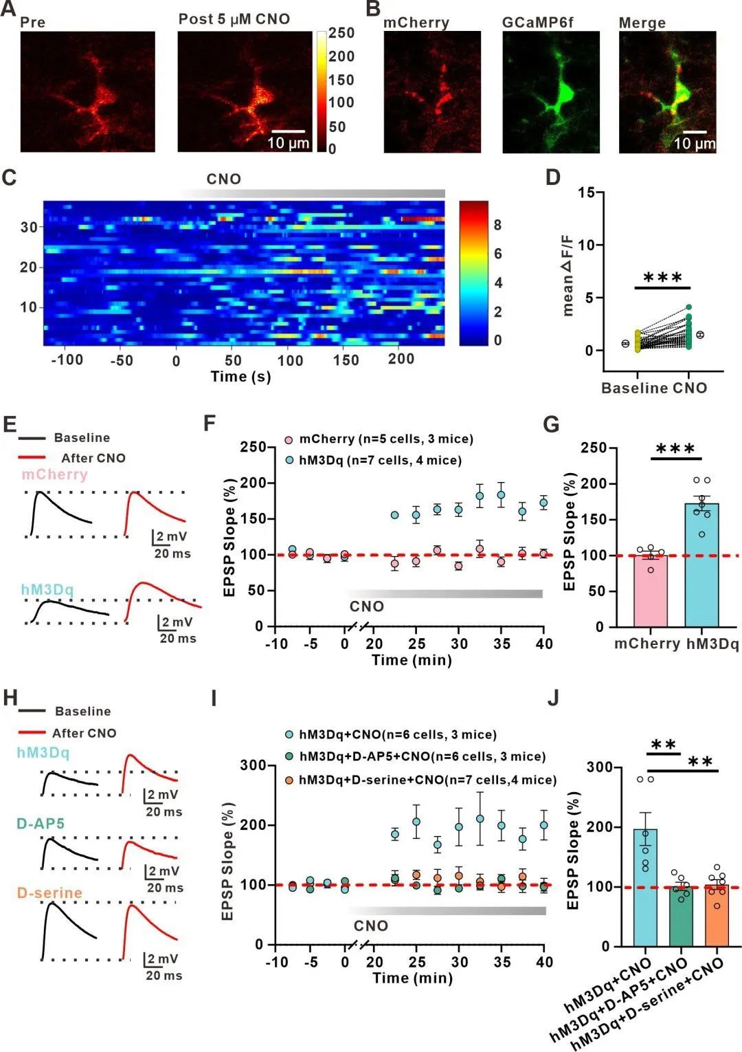 通过脑立体定位注射病毒、穿孔膜片钳、钙成像等实验方法探究了星胶调节LTPE→I形成的内在分子机制,发现星胶是通过激活CB1R介导的钙离子的升高,而释放D-serine,来调控海马CA1辐射层中的LTPE→I的形成。(图2)