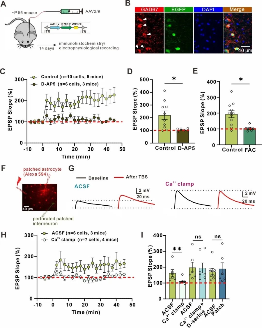 图1.星形胶质细胞参与海马stratum radiatum 中间神经元NMDAR依赖的LTPE→I