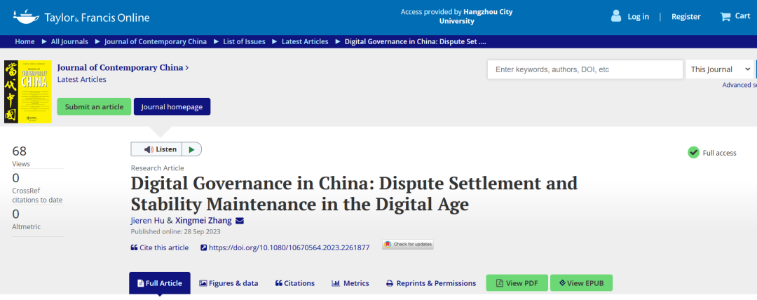 近日,我院胡洁人副教授与吉林大学法学院张兴美教授在国际学术期刊Journal of Contemporary China 合作发表了题为“Digital Governance in China: Dispute Settlement and Social Stability Maintenance in the Digital Age”的论文。
